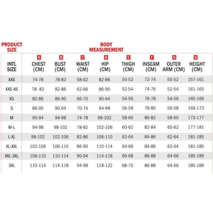 | 52 | 2XL/3XL | 185-188 | 106-110 | 90-94 | 114-118 | 64-65 |